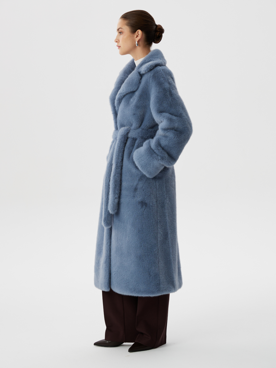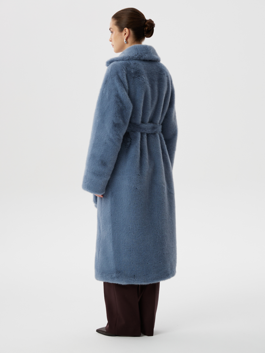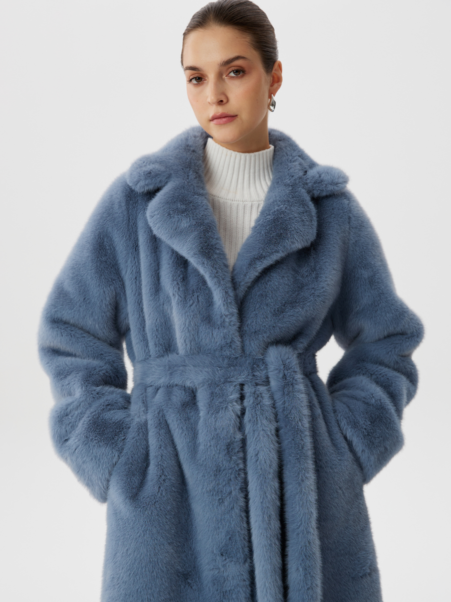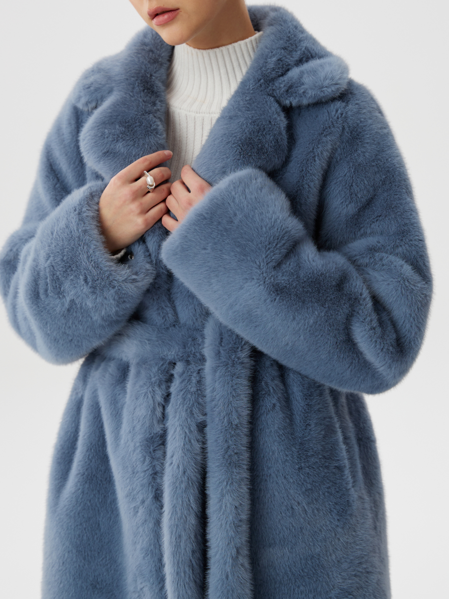 Шуба из эко-меха с поясом и английским воротником в небесно-голубом цвете