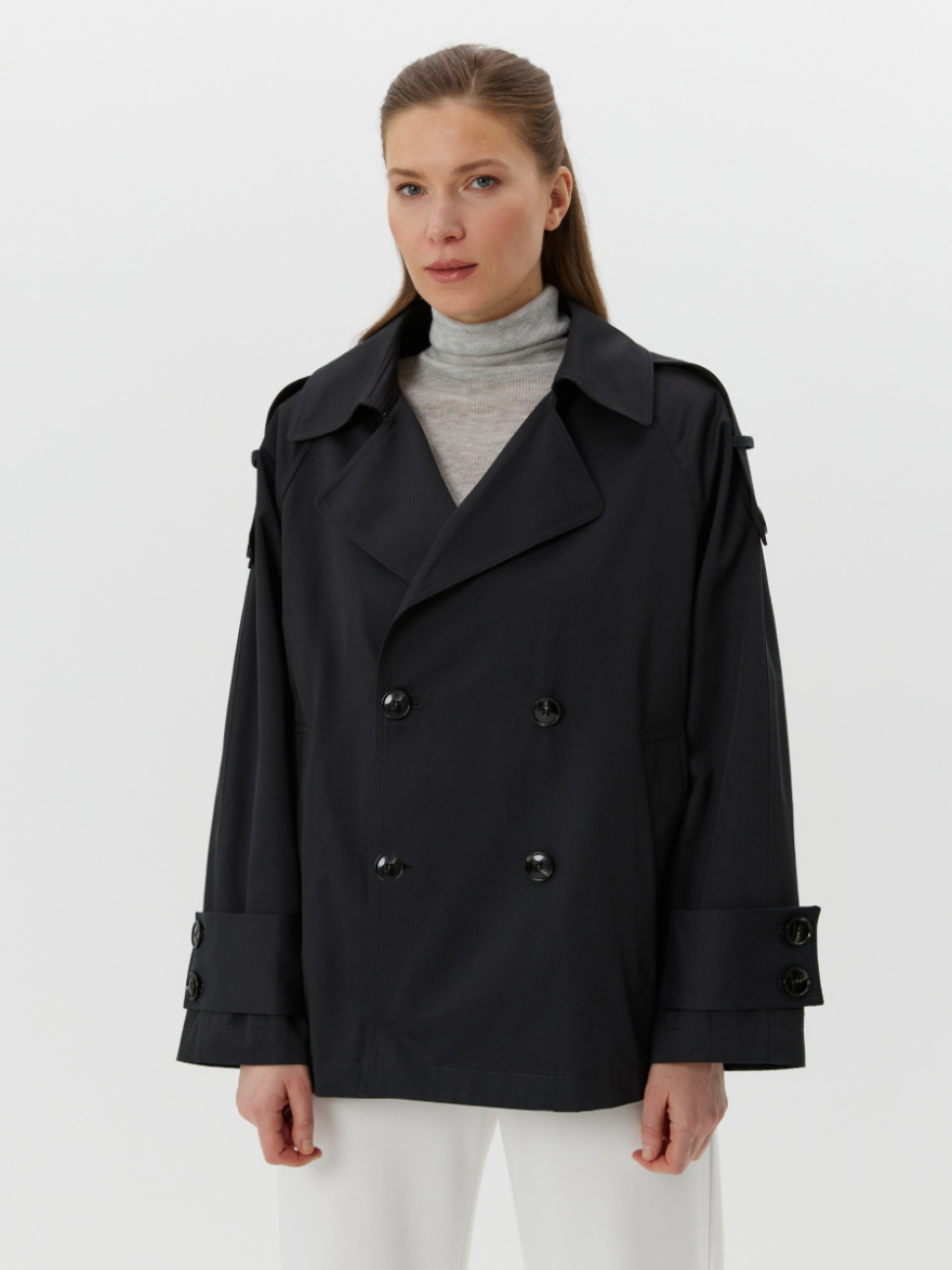 Укороченный двубортный тренч свободного силуэта. У этой модели плавная линия реглана, широкая кокетка сзади, акцентная пряжка на рукаве. Звстегивается на пуговицы, дополнен погонами.