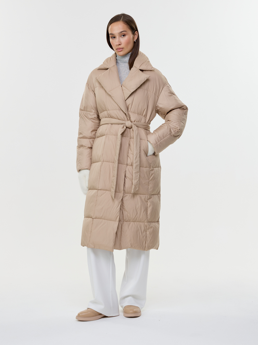 Утепленное плащевое пальто с английским воротом и боковыми карманами, дополненное поясом. Утеплитель биопух.