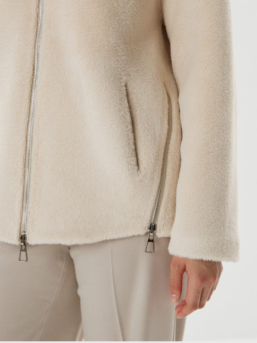 Женская двухсторонняя дублёнка с капюшоном и молнией в цвете шампань