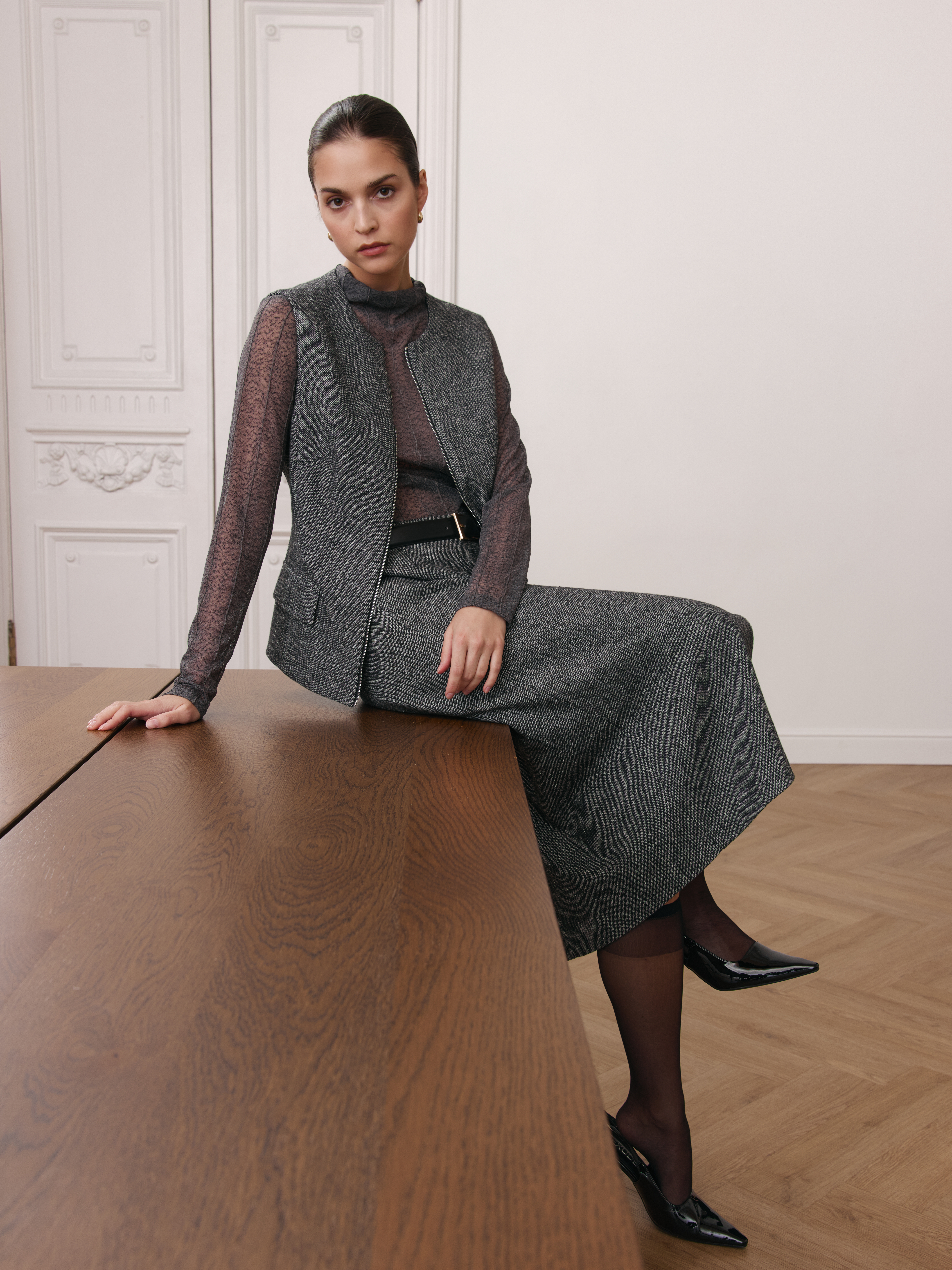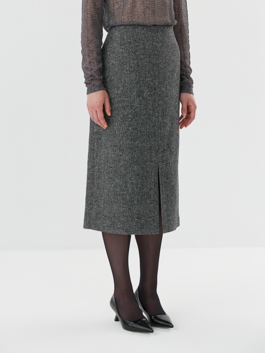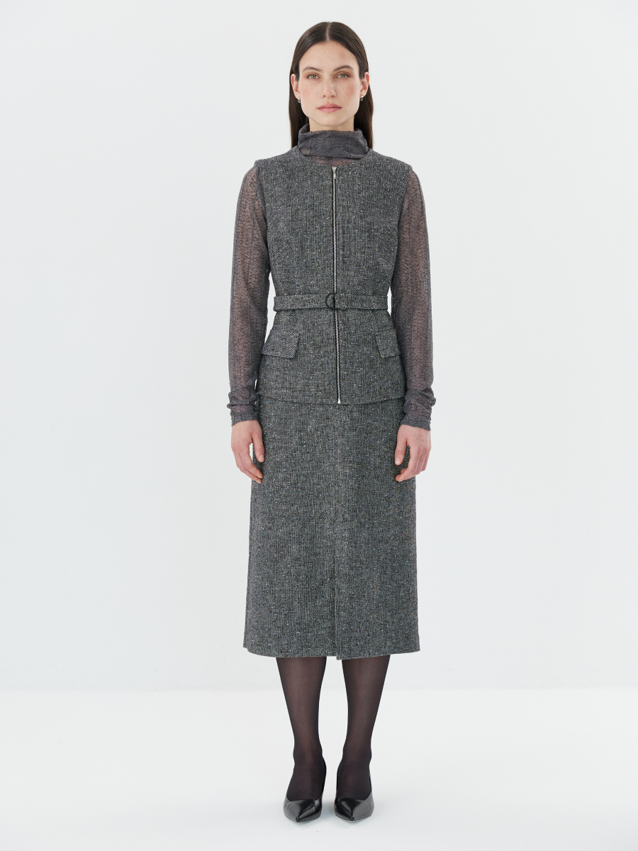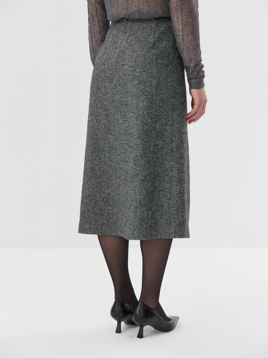 Юбка трапециевидного силуэта длины миди — элегантная и универсальная модель, выполненная из респектабельной твидовой ткани. Структурная фактура подчёркивает актуальность материала и придаёт образу благородную сдержанность. Разрез в центральном шве спереди добавляет динамики и акцентирует вертикаль, визуально вытягивая силуэт. Юбка выполнена на подкладке из комфортной вискозы, что делает посадку особенно приятной и комфортной в течение дня. Модель легко сочетается с базовыми рубашками, блузами или джемперами, а в паре с жилетом 2.9.1-431 формирует продуманный комплект в актуальном твидовом исполнении.