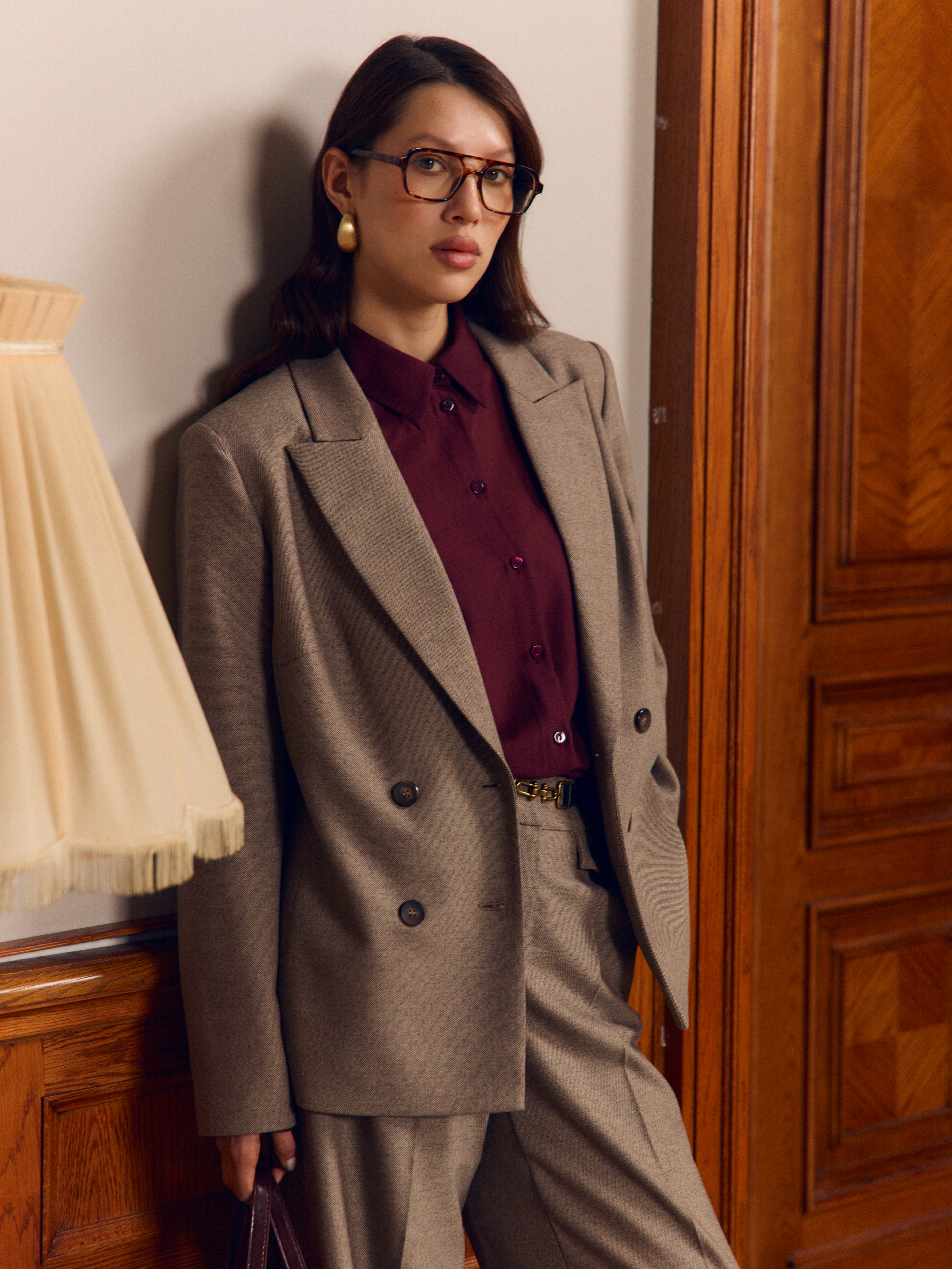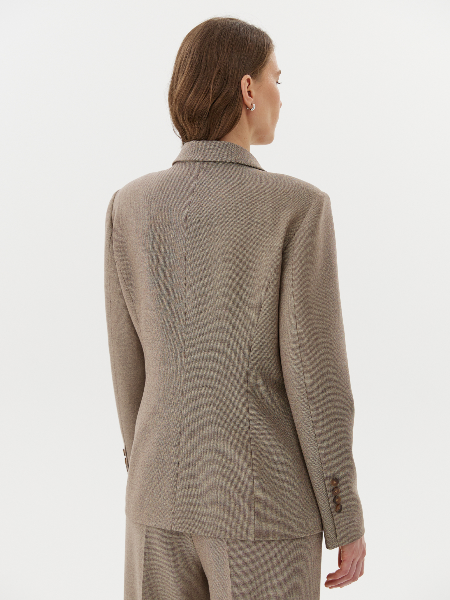 Жакет двубортный полу-приталенного силуэта из мягкой поливискозы с твидовым переплетением — сдержанная и элегантная модель с акцентом на посадку и фактуру. Ткань с твидовой текстурой придаёт образу визуальную глубину, а комфортная подкладка с добавлением вискозы делает изделие приятным в носке. Рельефные швы и нагрудные вытачки формируют женственный силуэт и обеспечивают точную посадку по фигуре. Застёжка на пуговицы по полочке подчёркивает классический характер модели, а ложные шлицы с пуговицами на рукавах и центральная шлица по спинке завершают образ выверенными деталями. Жакет составляет единый ансамбль с брюками 2.5.2-268 и 2.5.1-294, позволяя собрать сбалансированный образ в деловом или повседневном стиле с акцентом на комфорт, структуру и мягкую классику.