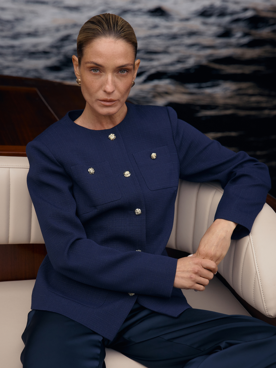 Жакет полуприлегающего силуэта. Актуальная длина до середины бедер. Акцентные накладные карманы и фурнитура в цвете матового золота. Модель выполнена из эффектной твидовой ткани с выразительной и деликатной фактурой в рубчик в цвете ночного неба. Жакет на подкладке. Жакет идеально комплектуется с брюками (2.5.2-110.6) и юбкой (2.4.3-849).