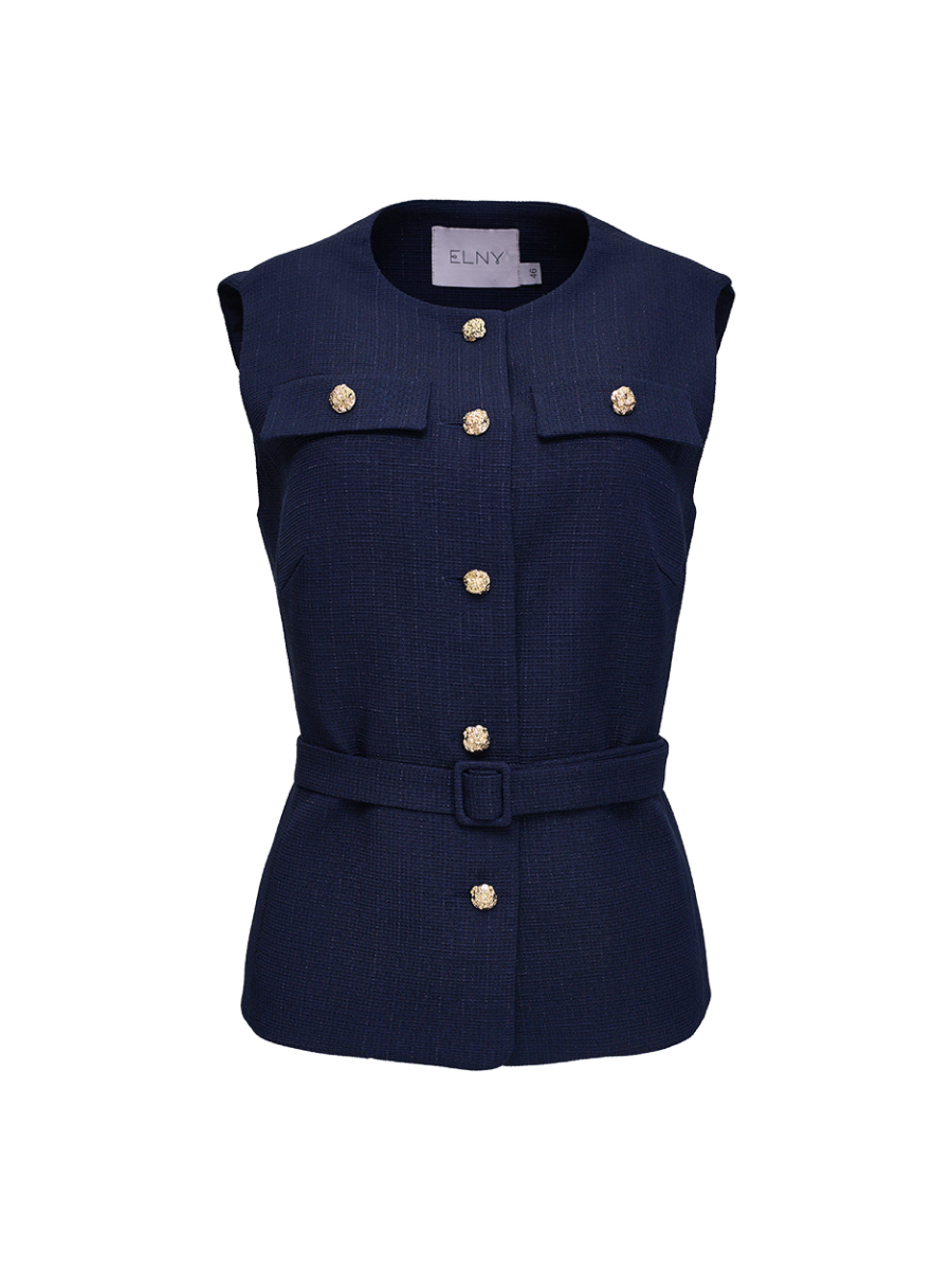 Жилет полуприлегающего силуэта. Актуальная длина до середины бедер. Акцентные накладные клапаны и фурнитура в цвете матового золота. Талию подчеркивает съемный пояс с пряжкой. Модель выполнена из эффектной твидовой ткани с выразительной и деликатной фактурой в рубчик в цвете ночного неба. Жилет на подкладке. Жилет идеально комплектуется с брюками (2.5.2-110.6) и юбкой (2.4.3-849).
