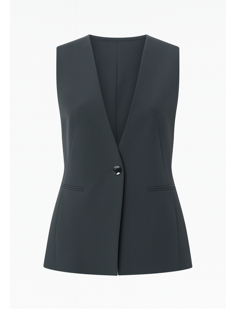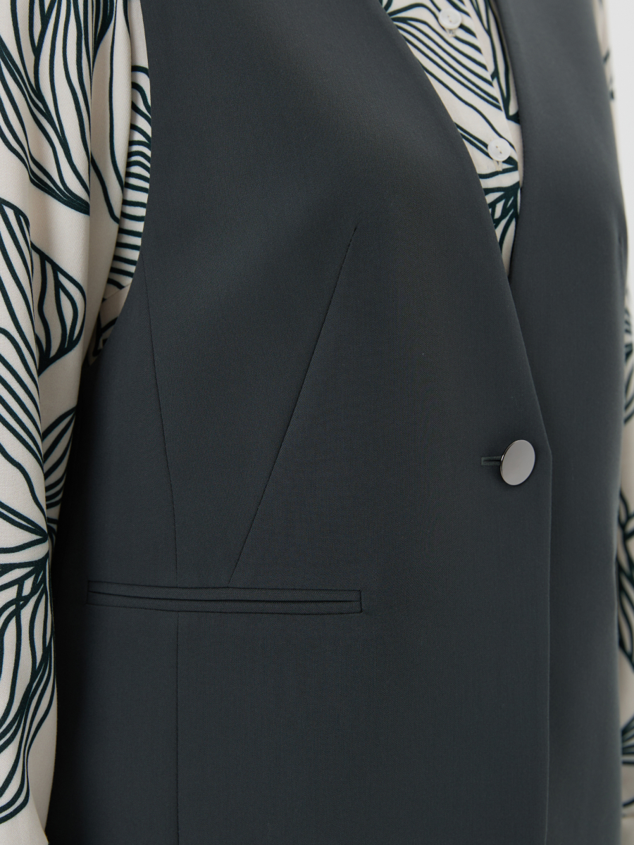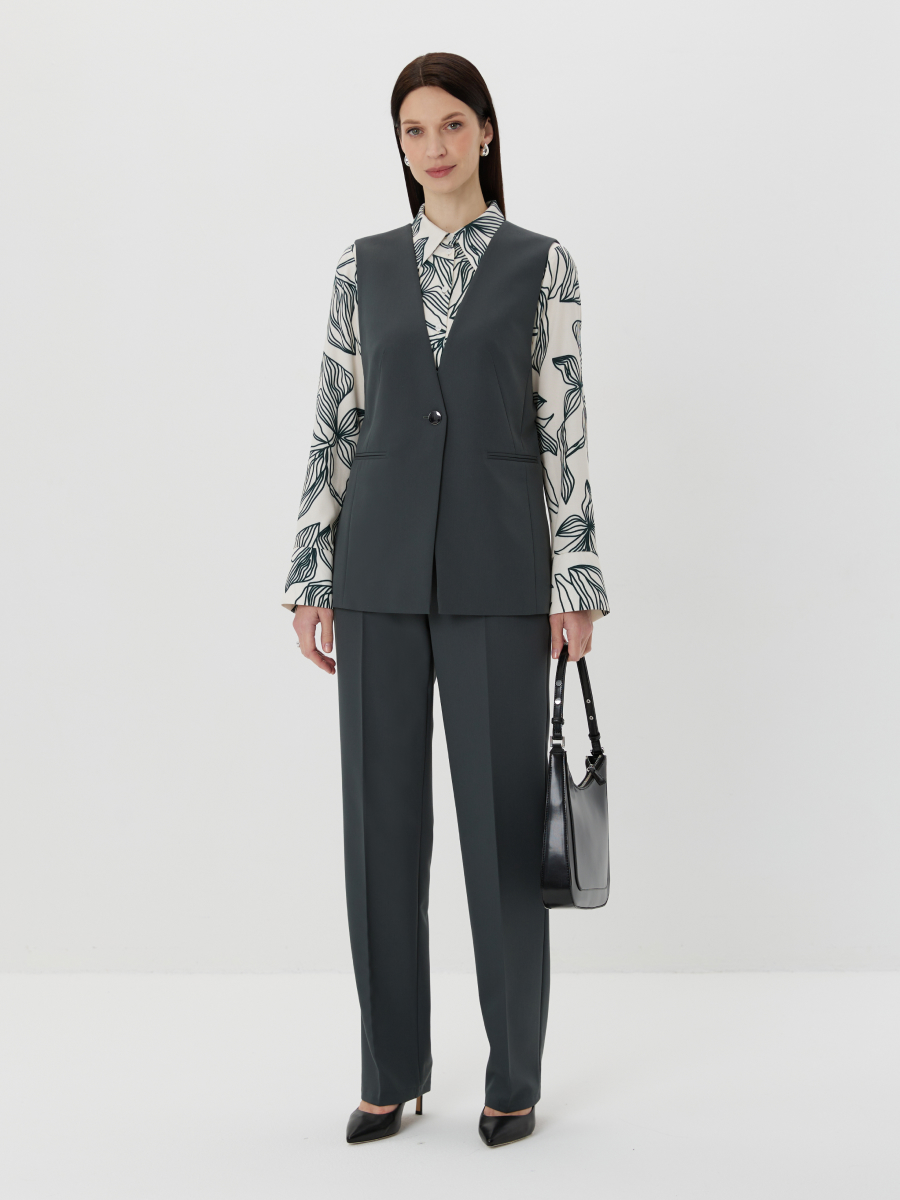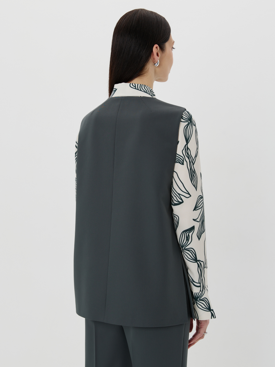 Оверсайз жилет прямого силуэта. Удлинённая модель свободного кроя с акцентными линиями кроя. Комфортные боковые разрезы обеспечивают свободу движения. Жилет выполнен из костюмной ткани в табачном цвете. Составляет комплект с зауженными брюками (2.5.1-267) и брюками прямого силуэта (2.5.2-292).