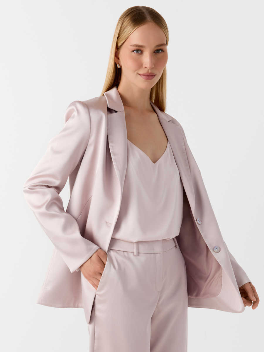 Нарядный жакет без подкладки. Модель выполнена из шелковистой ткани с атласным переплетением в цвете розовый жемчуг. Прямой силуэт. Втачные рукава полной длины. В капсуле комбинируется с брюками 2.5.2-110 и юбкой 2.4.3-102