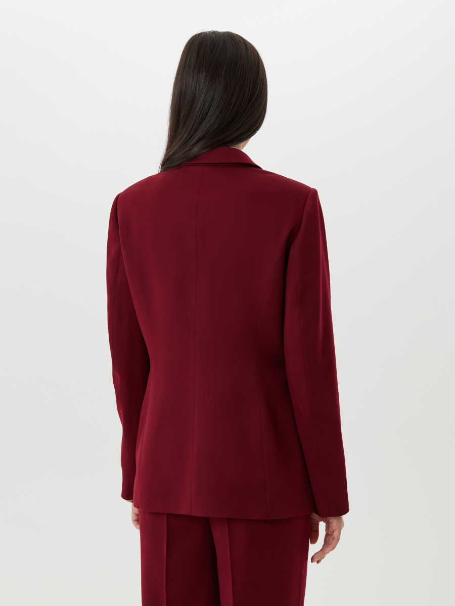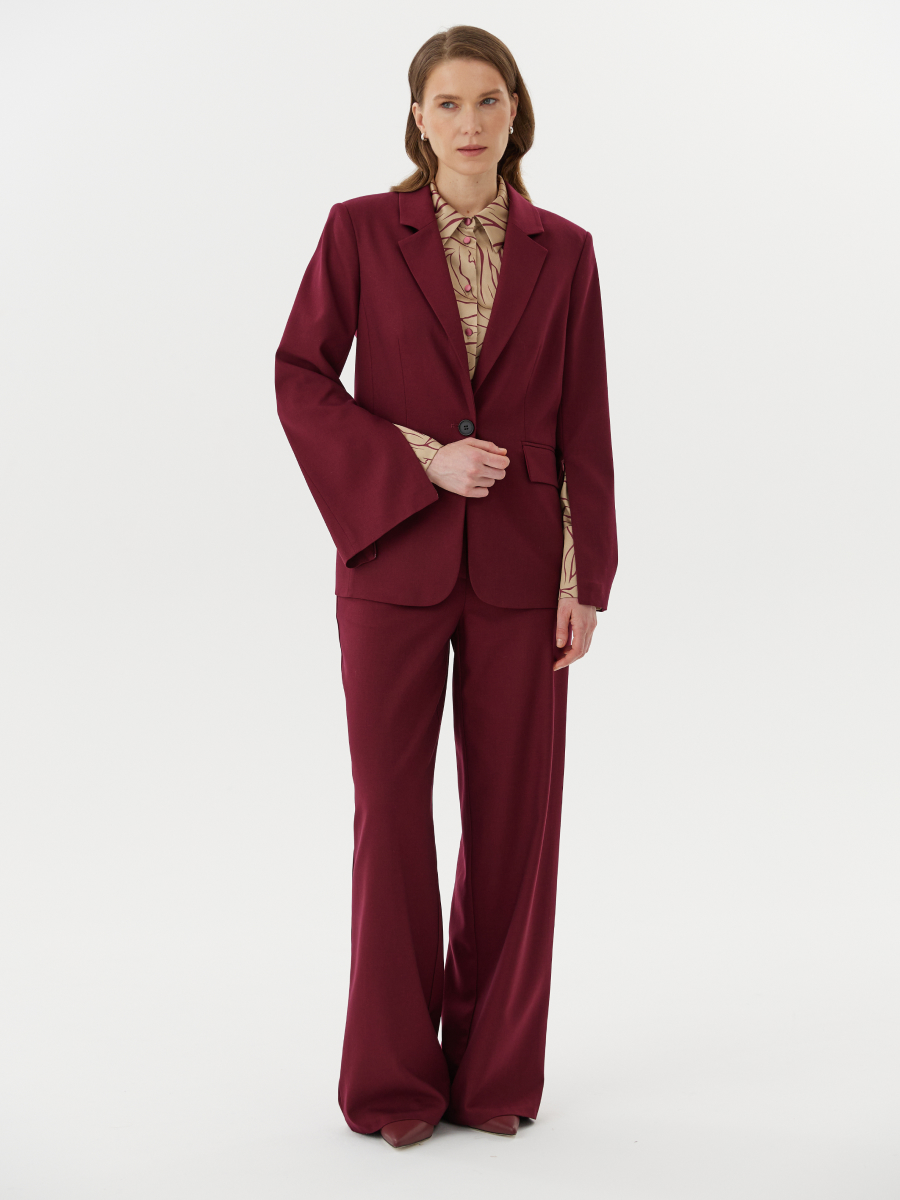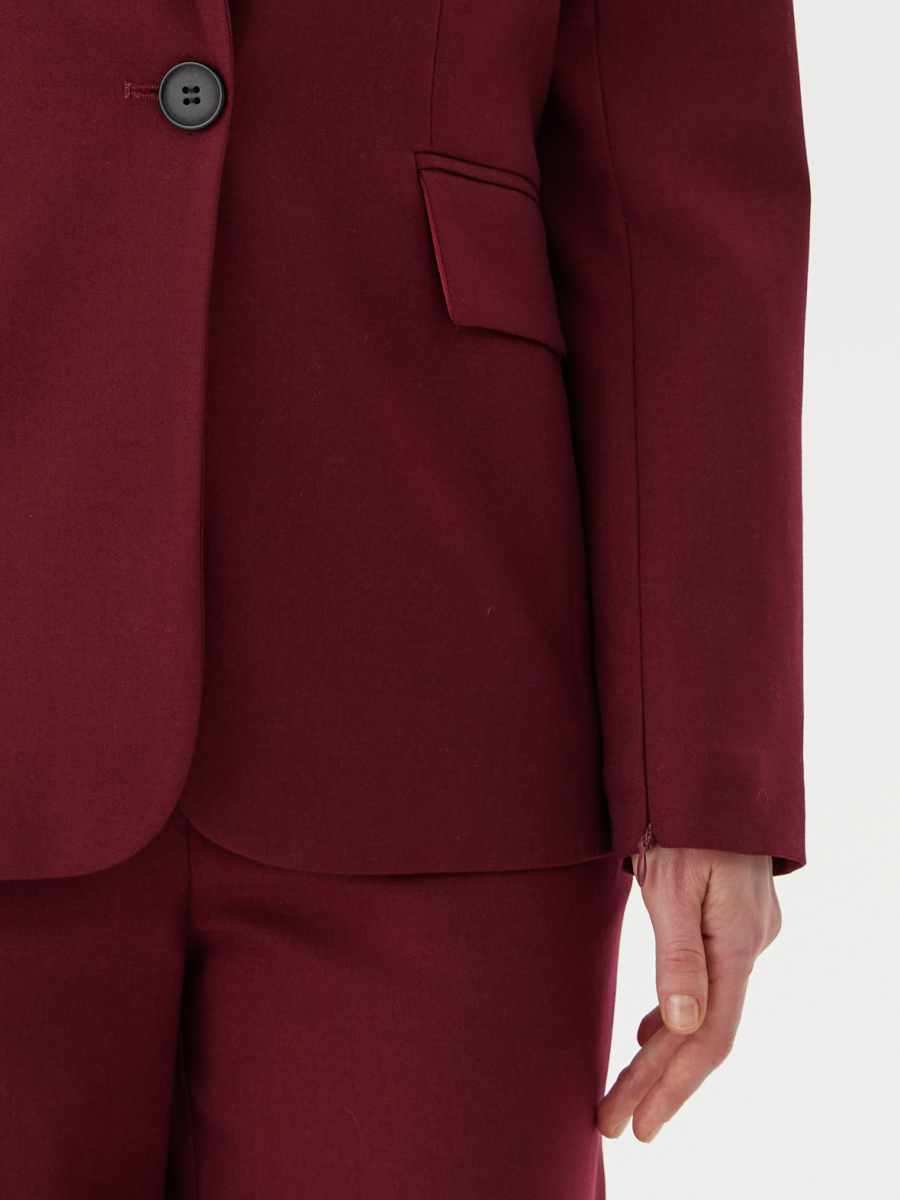 Жакет однобортный полу-прилегающего силуэта из мягкой костюмной поливискозы — выразительная модель в насыщенном оттенке мерло, сочетающая классический стиль с трендовыми деталями. Благодаря благородной фактуре ткани и выверенному крою, жакет смотрится элегантно и современно. Особое внимание привлекают рукава с эффектом кейпа: потайная молния позволяет регулировать раскрытие — от лёгкого расклёшенного акцента до полностью закрытого варианта, а при необходимости рукав можно полностью убрать. Классические элементы — лацкан актуальной формы, застёжка на пуговицу, закруглённый край борта — придают модели утончённость. Рельефные швы и вытачки создают чёткий силуэт и идеальную посадку по фигуре. Жакет образует актуальный костюм с брюками 2.5.1-267 или 2.5.2-266 — для создания выразительного делового или вечернего образа с акцентом на индивидуальность и современный крой.