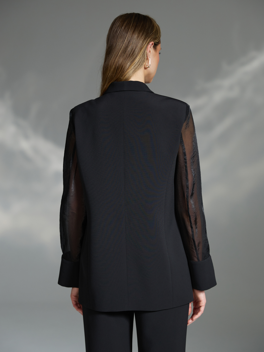 Жакет прямого силуэта выполнен из плотного черного крепа и дополнен акцентными рукавами из прозрачной органзы, придающими модели легкость и актуальность. Воротник-шаль визуально вытягивает силуэт и подчеркивает элегантность линии плеч. Однобортная застежка на пуговицу сохраняет лаконичность и акцентирует вертикаль образа. Фактурное сочетание плотного крепа и невесомой органзы делает жакет выразительным и трендовым элементом гардероба. Модель идеально сочетается с брюками и юбками из капсулы, позволяя создавать цельные и эффектные образы для особых случаев и вечерних выходов. Этот однобортный жакет с прозрачными рукавами — стильное решение для тех, кто ценит сочетание строгости и актуальных деталей.